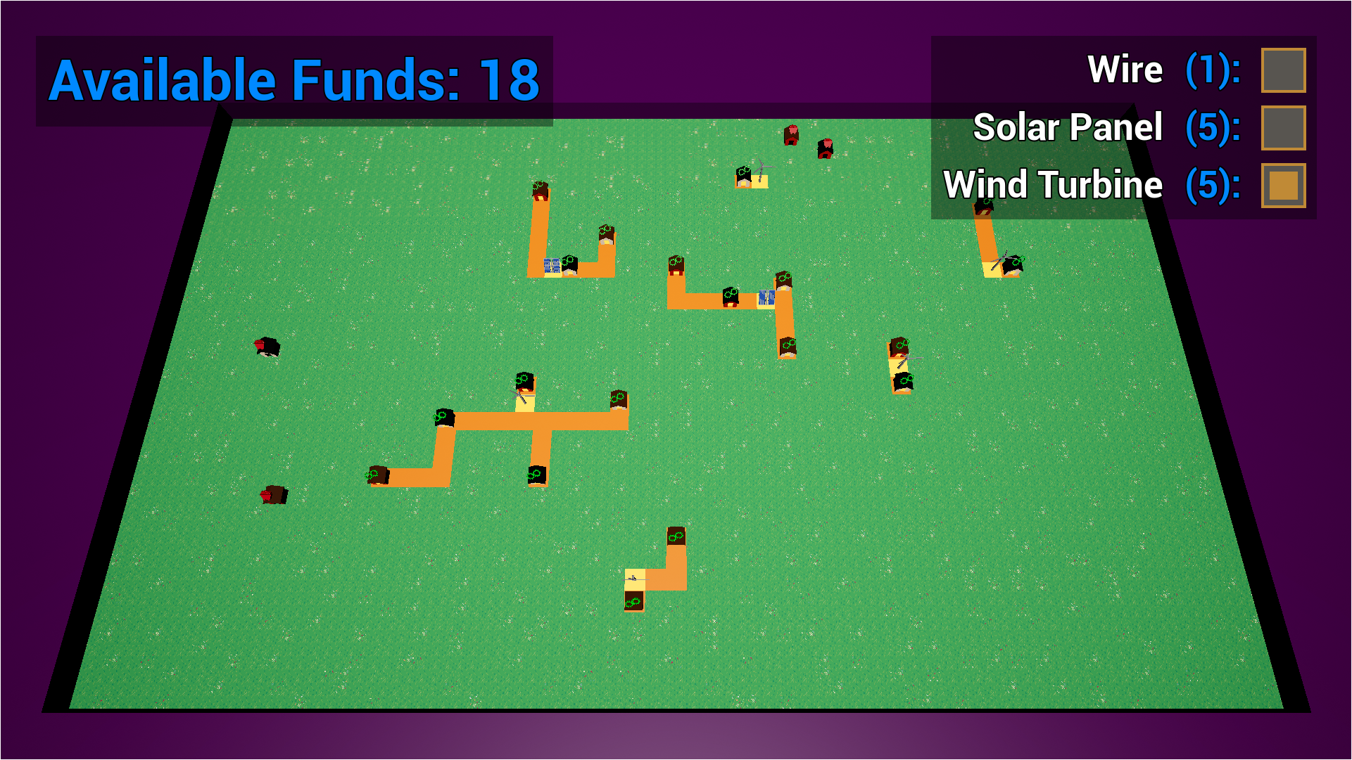 Beginning with 11 funds, use the list in the top-right corner of the screen to select a renewable energy source to place, left-clicking on a tile to place it. Placed assets can be removed by right-clicking on them. To keep track of how many funds you have remaining, refer to the top-left corner of the screen.